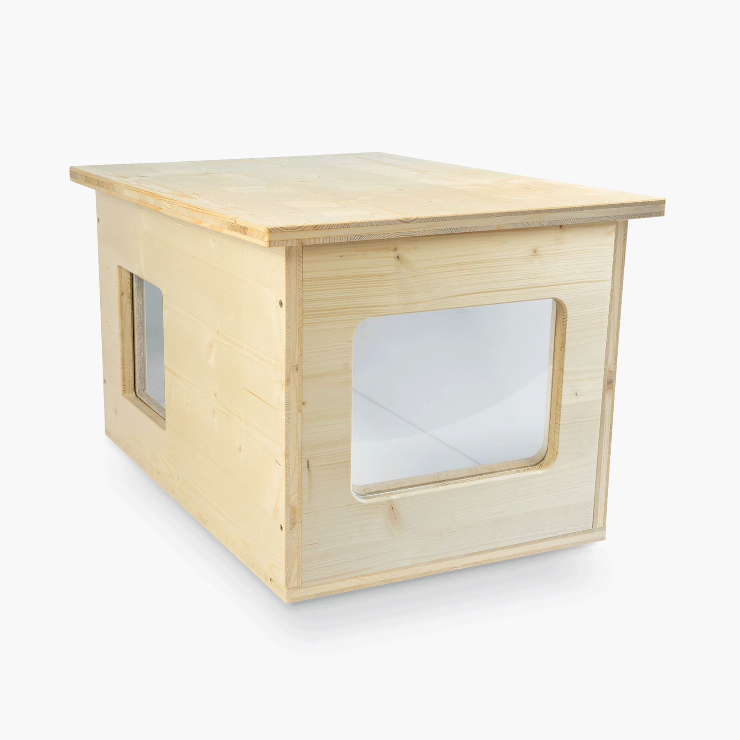 Stell Dir Dein Katzenhaus individuell zusammen und passe es jederzeit an – mit Fenster, Katzenklappe oder Isolierung.