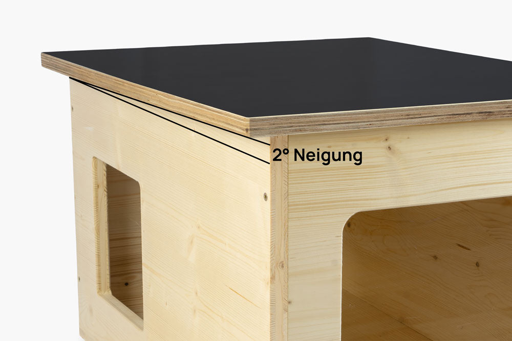 Das Dach ist um 2° geneigt. So läuft Regenwasser zuverlässig ab und bei Sonnenschein hat deine Katze eine perfekte, bequeme Liegefläche.