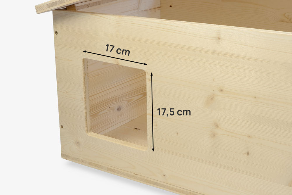 Der Eingang ist 17 × 17,5 cm groß und bietet deiner Katze genug Platz zum Ein- und Ausgehen. Auf Wunsch kannst du zusätzlich eine Katzenklappe einbauen – alle von uns angebotenen Modelle passen perfekt.